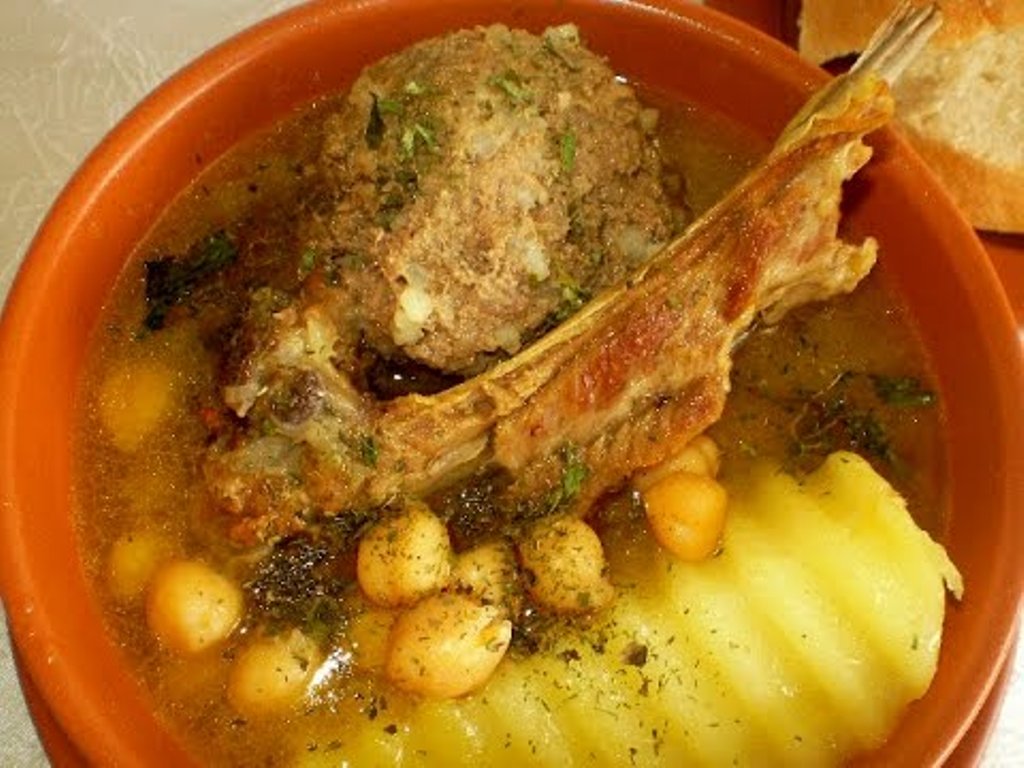 Mal əti, kartof, soğan, yağ, noxud