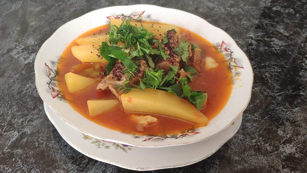 Mal əti,tomat,kartof,soğan,yağ,duz,istiot,su, göy