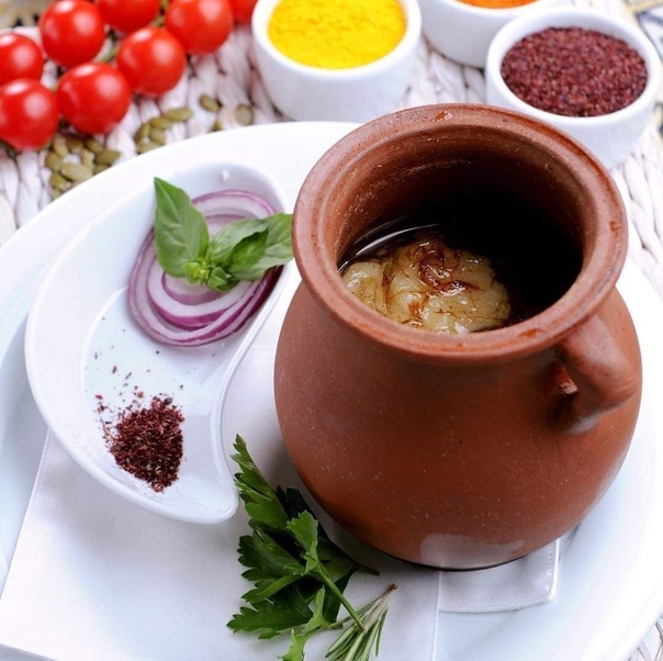 Qoyun əti,quyruq,noxud,duz,istiot,zəfəran, sarıkök,su