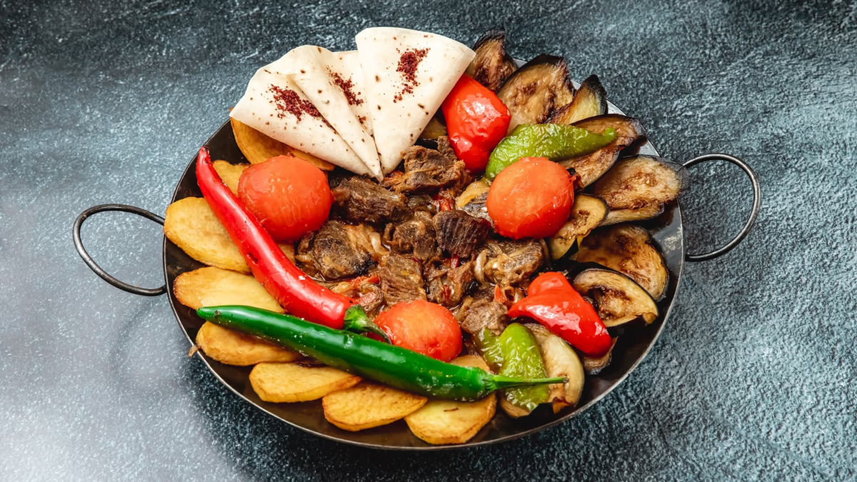 Quzu əti,badımcan,bibər,kartof,göbələk, suxarı,duz,istiot,pomidor,yağ