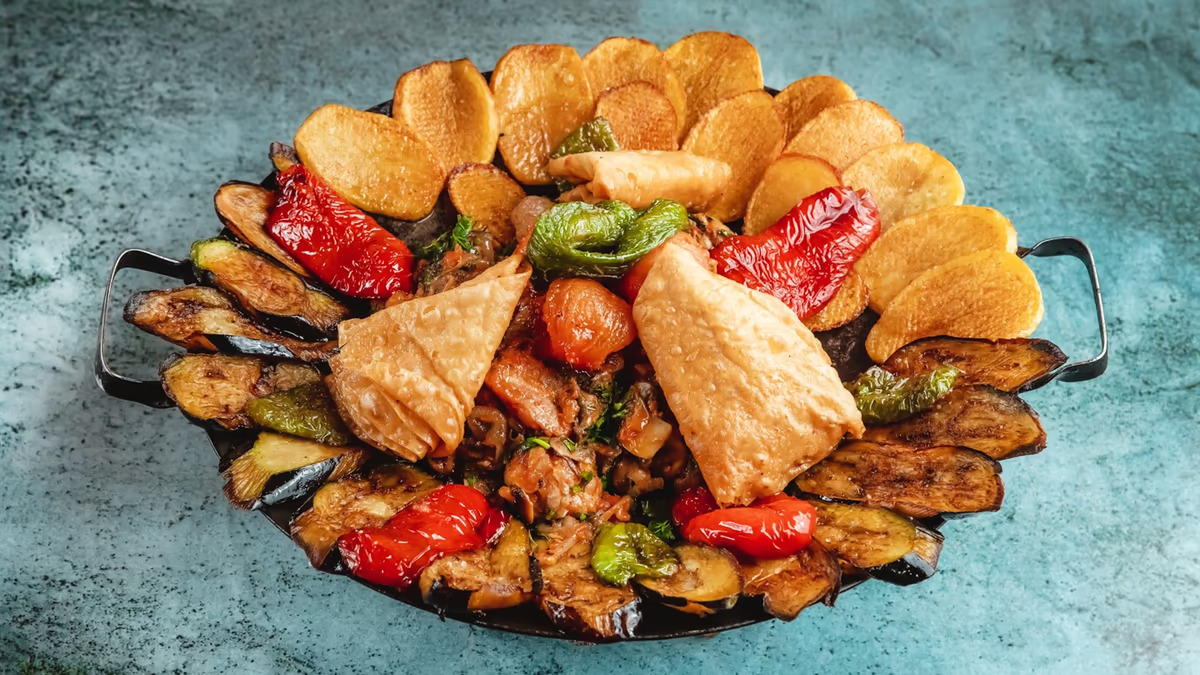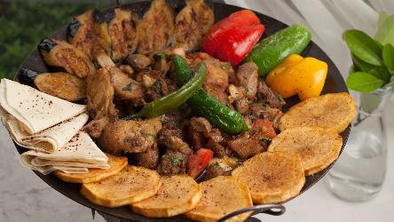 Dana ciyəri,badımcan,bibər,kartof,göbələk, suxarı,duz,istiot,pomidor,yağ