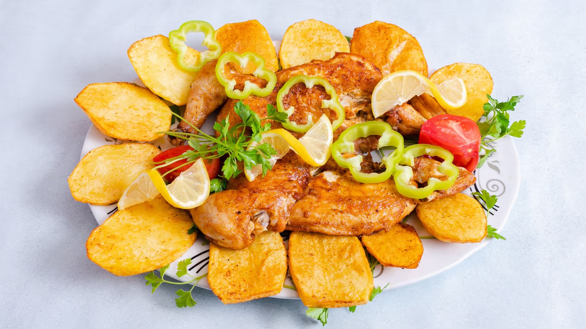 Brolyer toyuğu,yağ,kartof,tomat,duz,istiot